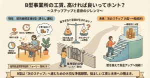 しゅうろうけいぞくしえんBがたは、ざっくりいうと、ちょっとたいへんなところがあって、ふつうの会社で働くのがむずかしい人が、おこづかい(こうちん)をもらいながら、ふつうの会社で働くことをめざす場所なんだって。